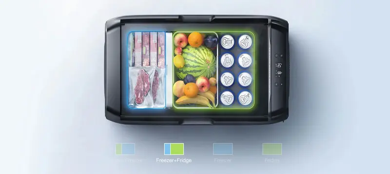 העיצוב הדו-אזורי (בדגמי 45/55L יכול אחסון מזון טרי וקפוא בו-זמנית, עם הפרש טמפרטורה של עד 22°C בין המתאימים. חיישנים מתקדמים שומרים על דיוק של ±1°C לשמירה מרבית על הטריות.