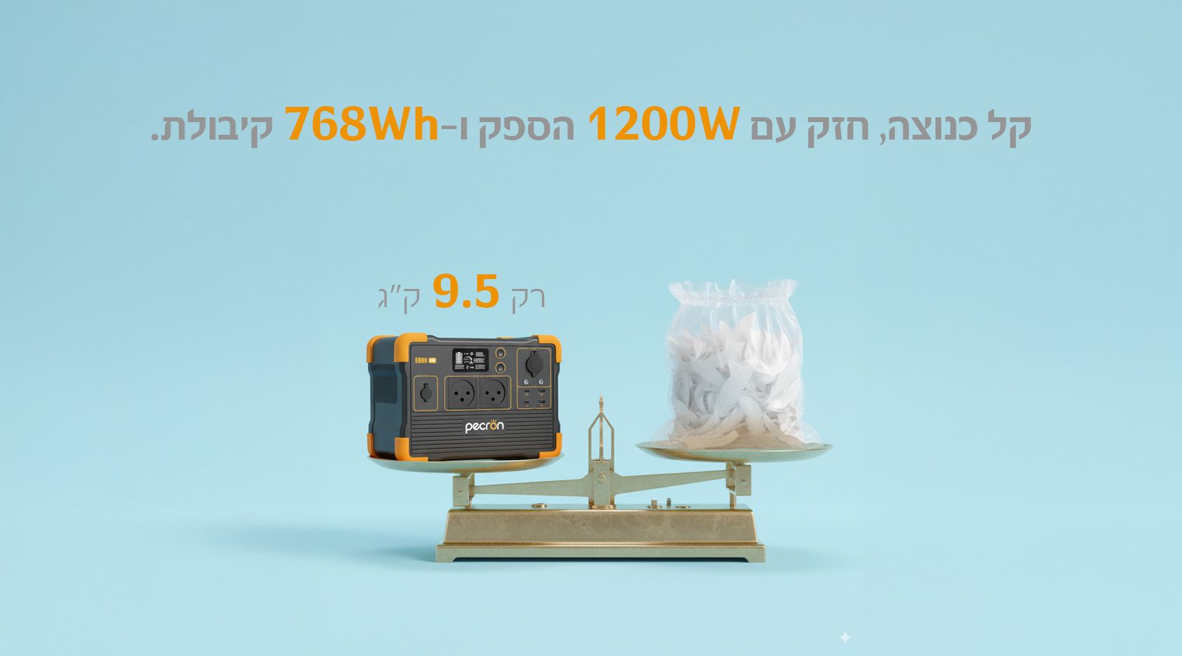 Pecron E800LFP שוקלת פחות מעשרה קילו אך כוללת סוללה עוצמתית של 768Wh ויותר מ־3500 מחזורי טעינה. היא נראית קטנה אבל מתפקדת כמו מערכת גיבוי מקצועית, ומאפשרת לך לקחת איתך עוצמה אמיתית לכל מקום בלי להתפשר על משקל או גודל.